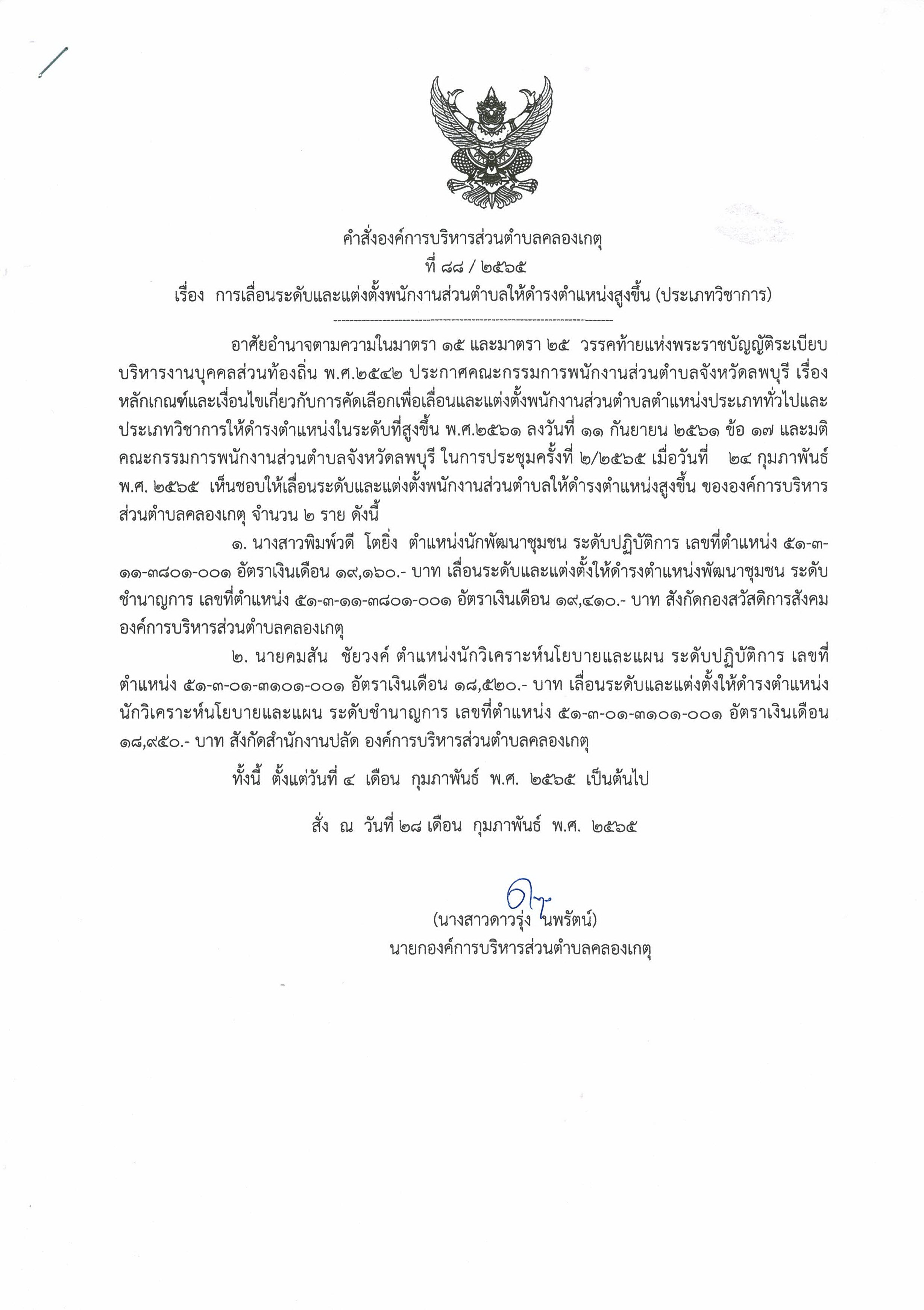 คำสั่ง เลื่อนระดับและแต่งตั้งพนักงานส่วนตำบลให้ดำรงตำแหน่งสูงขึ้น(ประเภทวิชาการ) ปี 2565
